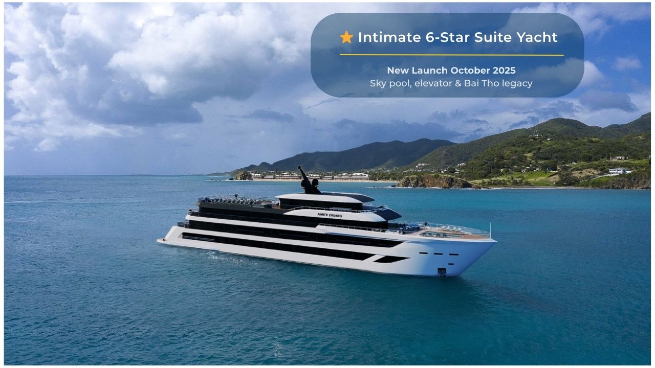 Aime’e Cruises is a brand-new, yacht-style ship operated by Bai Tho Junks, one of Halong’s most experienced cruise companies with over 30 years on the bay. It blends an intimate 29-suite layout and Indochine-inspired interiors with modern facilities like a jacuzzi pool, rooftop bar and spa. Travelers get a contemporary luxury experience while still sailing a classic Halong Bay route.