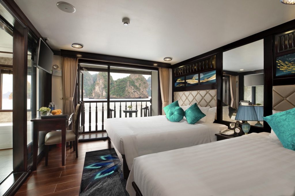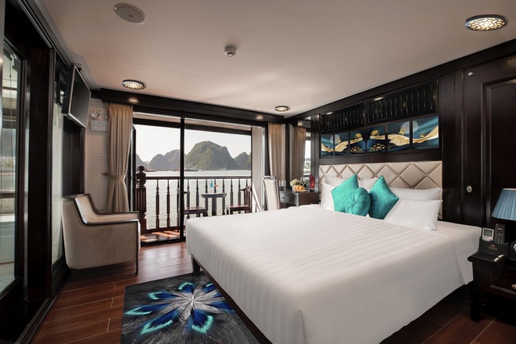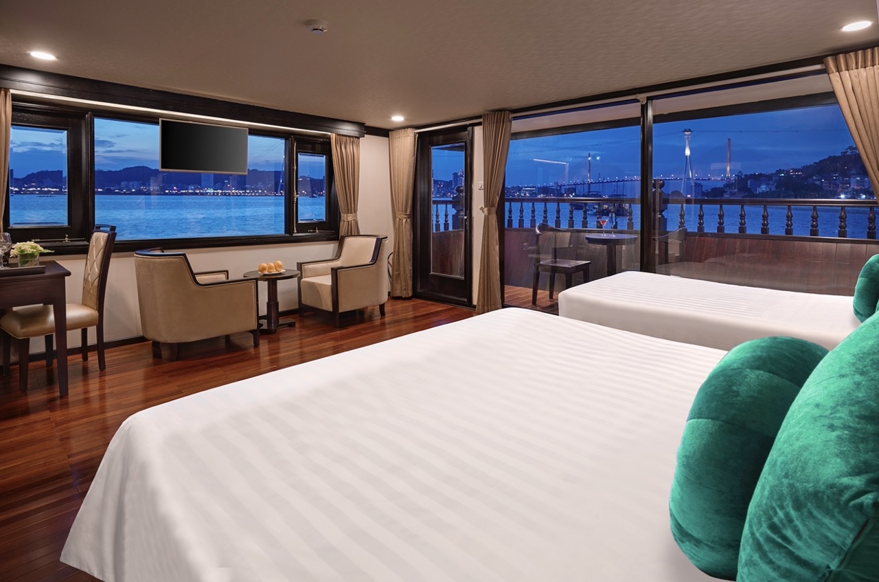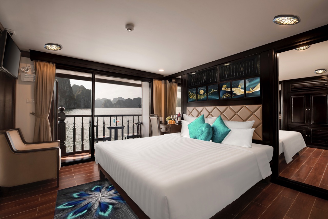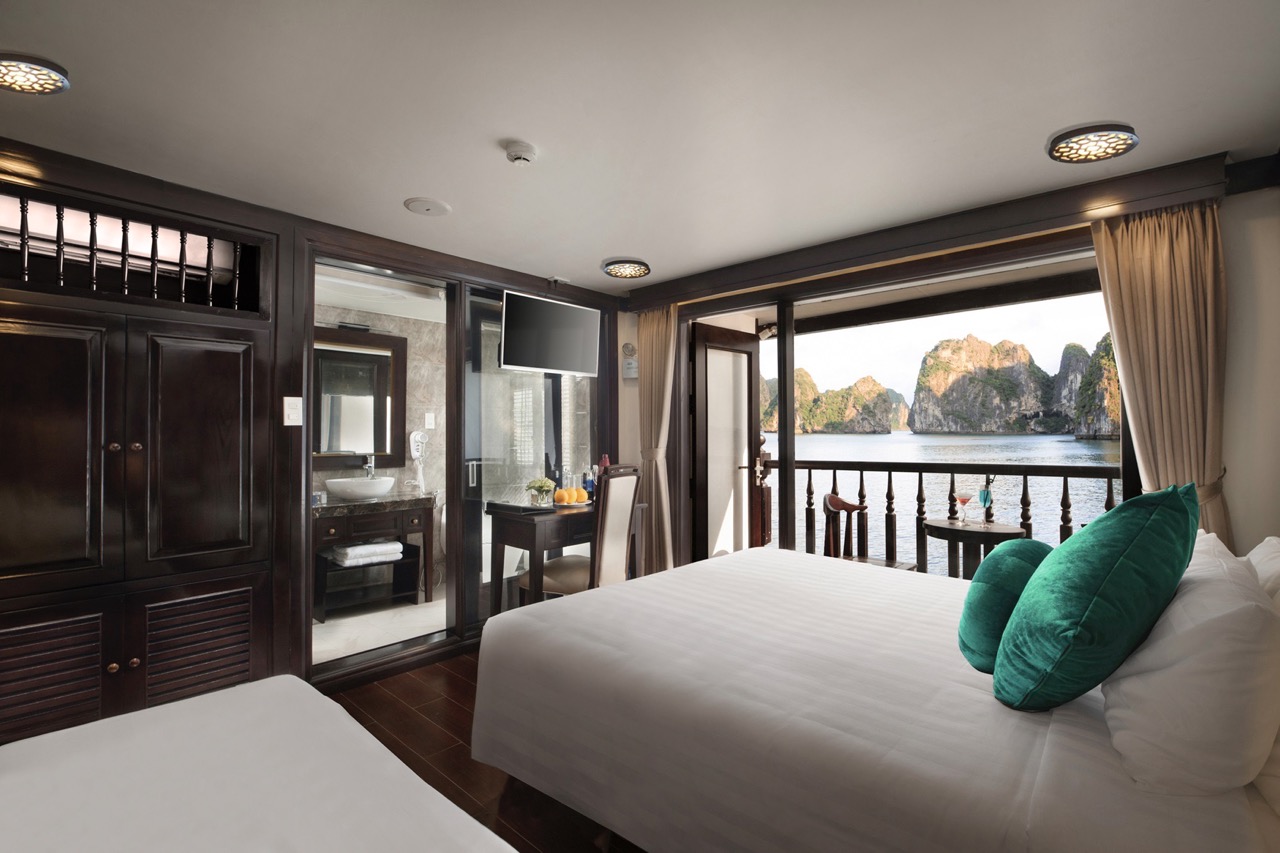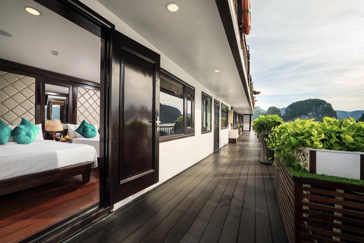 Spacious mid-deck suites with refined décor and a full private balcony overlooking Halong Bay.