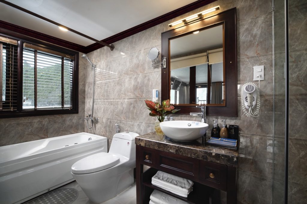 Choose from elegant cabins on Alisa Premier Cruise featuring large windows or balconies, en-suite bathrooms, and calm, contemporary décor. Higher-category rooms often offer wider views, bathtubs, or more generous space, which we recommend for honeymooners and families wanting extra comfort. ViettrendTour can pre-arrange special setups for anniversaries, birthdays, or family stays, turning your cabin into a personalized retreat floating in the heart of Halong Bay.