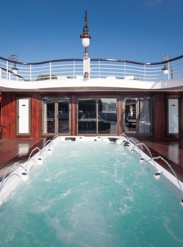 A larger 5-star vessel with expansive decks, open-air Jacuzzi space, refined Asian-European cuisine, live music, spa lounge, and polished service.