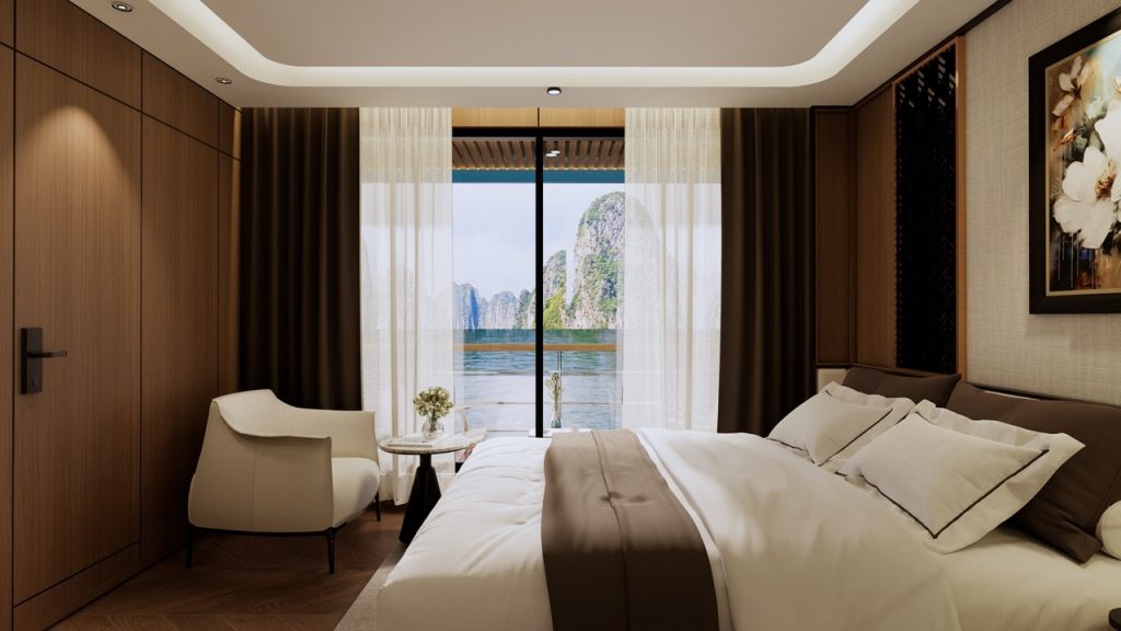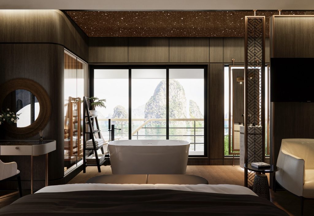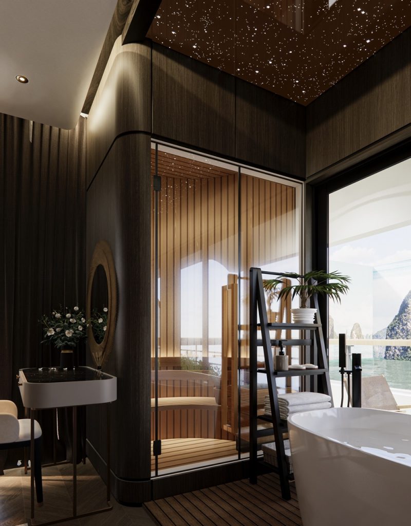 - Signature Imperial Suite concept: Top-tier suites combine seawater soaking tub, starry-sky ceiling, dry sauna and private putting green—features rarely shown together on one Halong vessel.