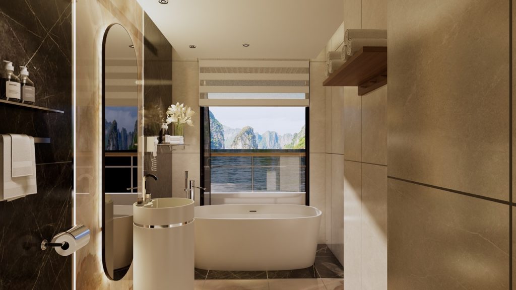 Cabins on Azura are designed like compact hotel suites, with large windows and private balconies that turn the bay into your own moving artwork. Selected categories include bathtubs overlooking the water, ideal for honeymooners or anyone who loves long soaks after a day of kayaking and exploring. ViettrendTour can recommend the best deck and cabin type depending on whether you prioritise quiet, quick pool access, or being close to the entertainment areas.