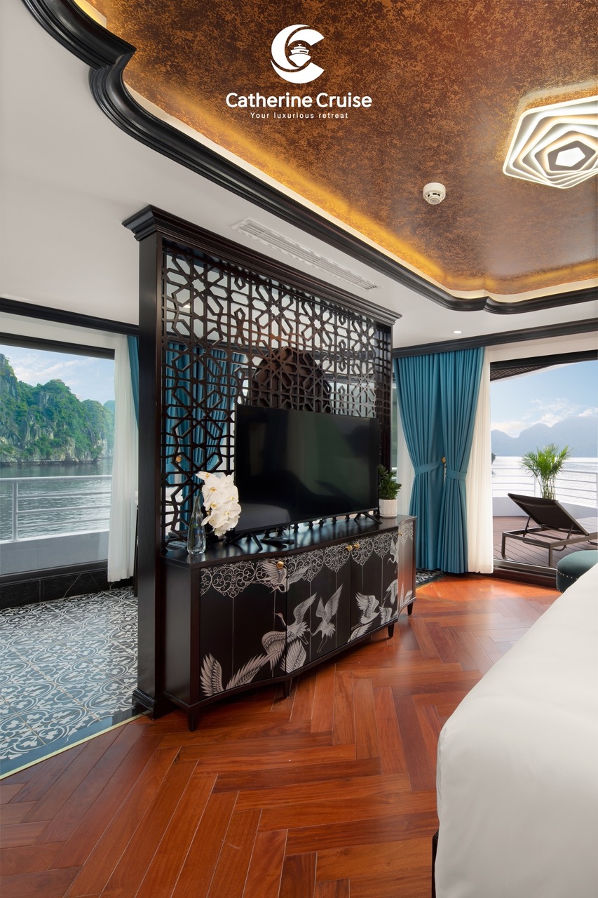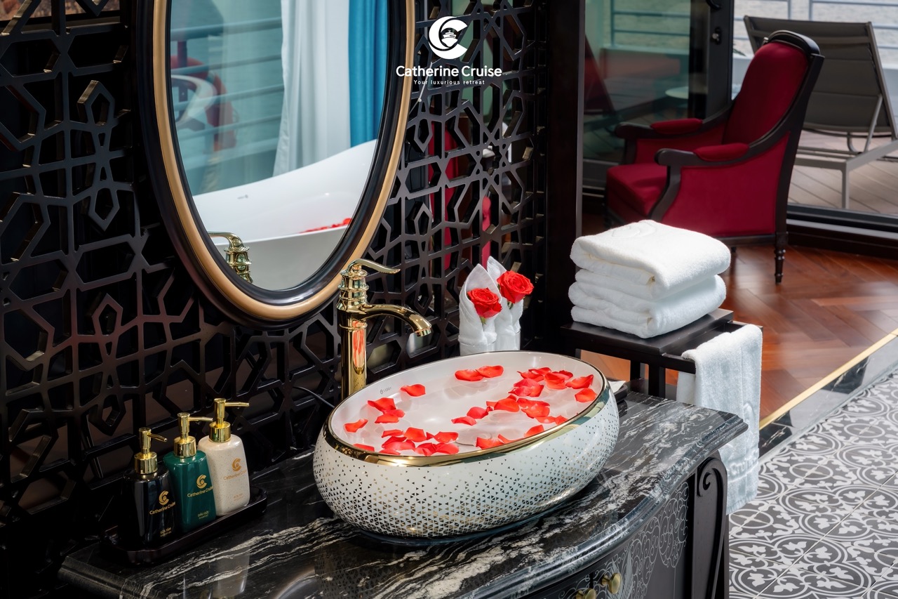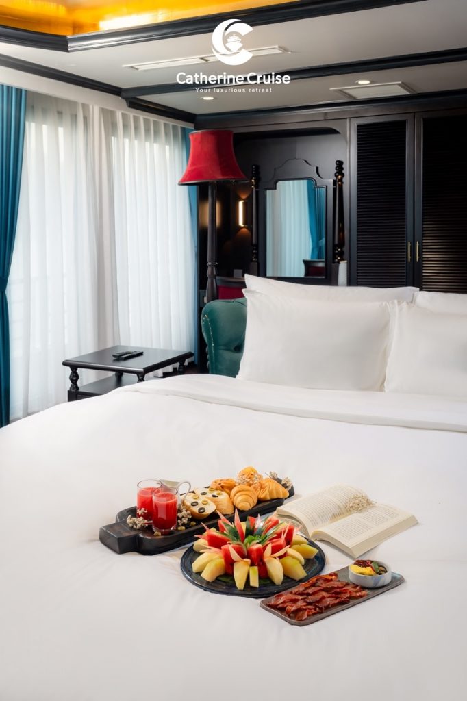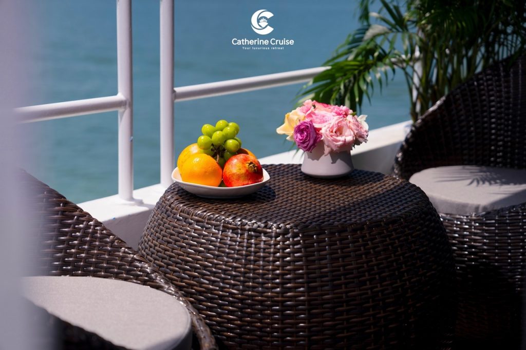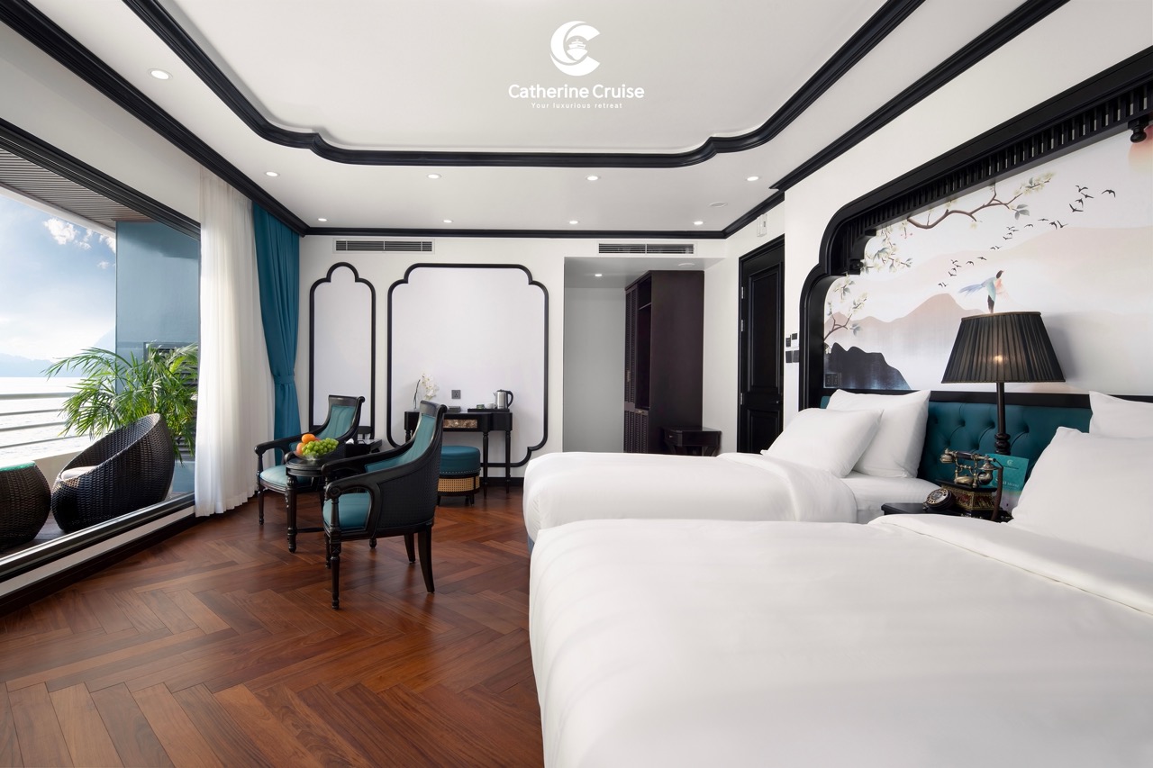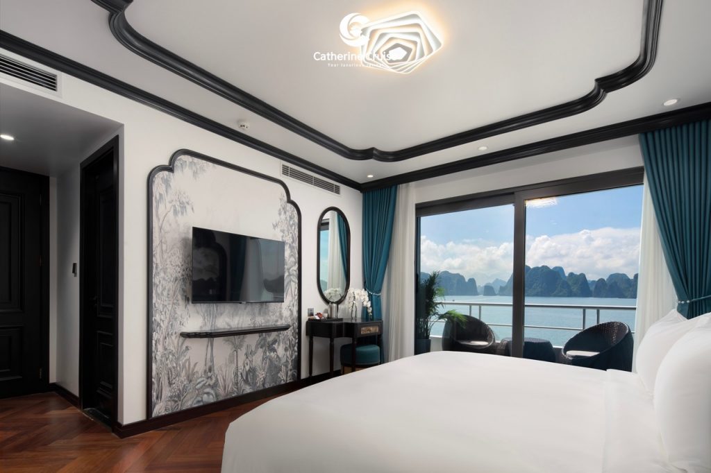 Every cabin on Catherine Cruise offers full sea view with a private balcony and bathtub, ensuring you never lose sight of Halong Bayโs scenery.