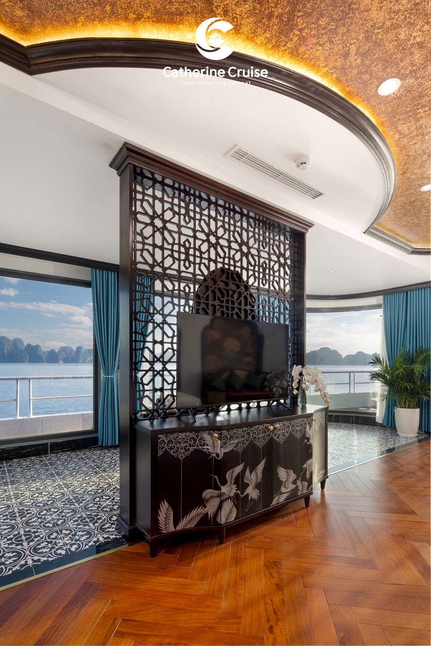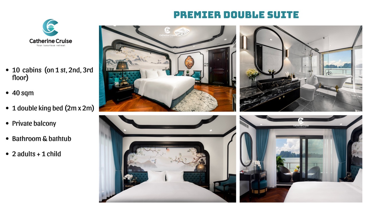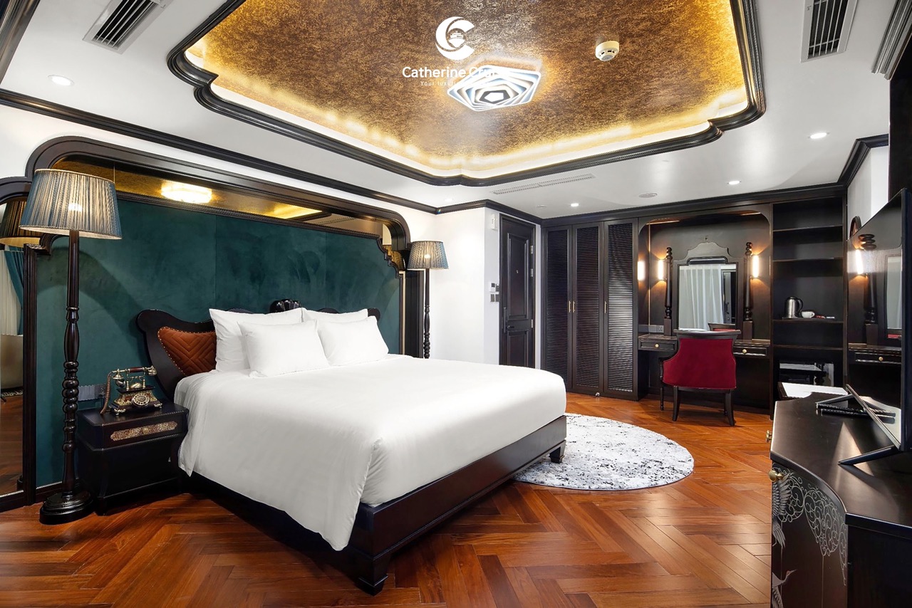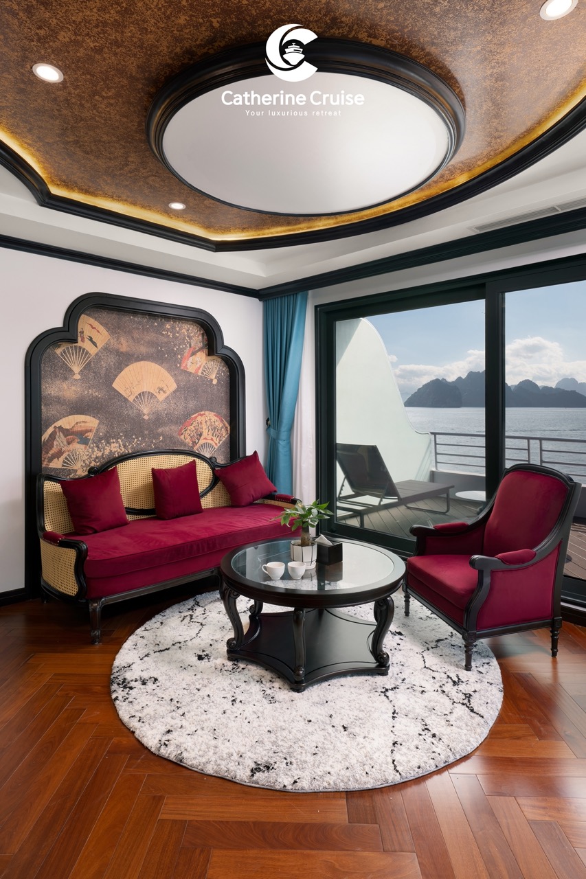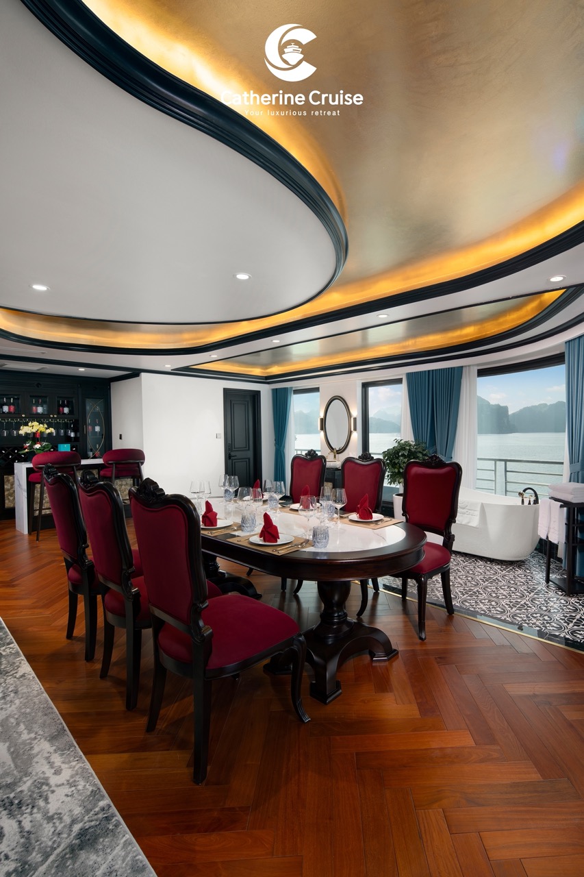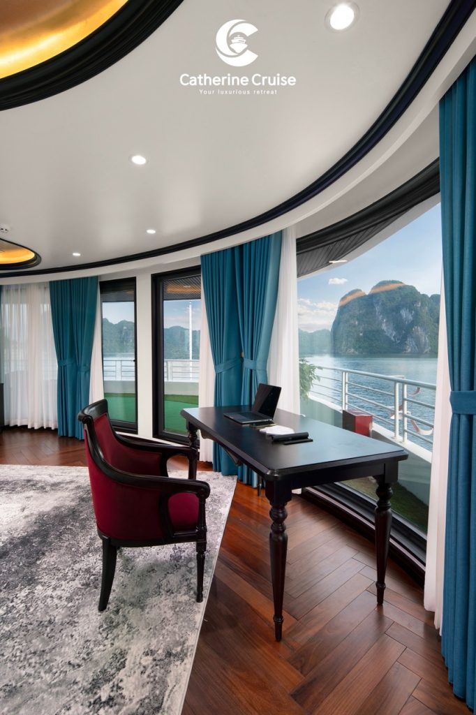 Every cabin on Catherine Cruise offers full sea view with a private balcony and bathtub, ensuring you never lose sight of Halong Bayโs scenery.