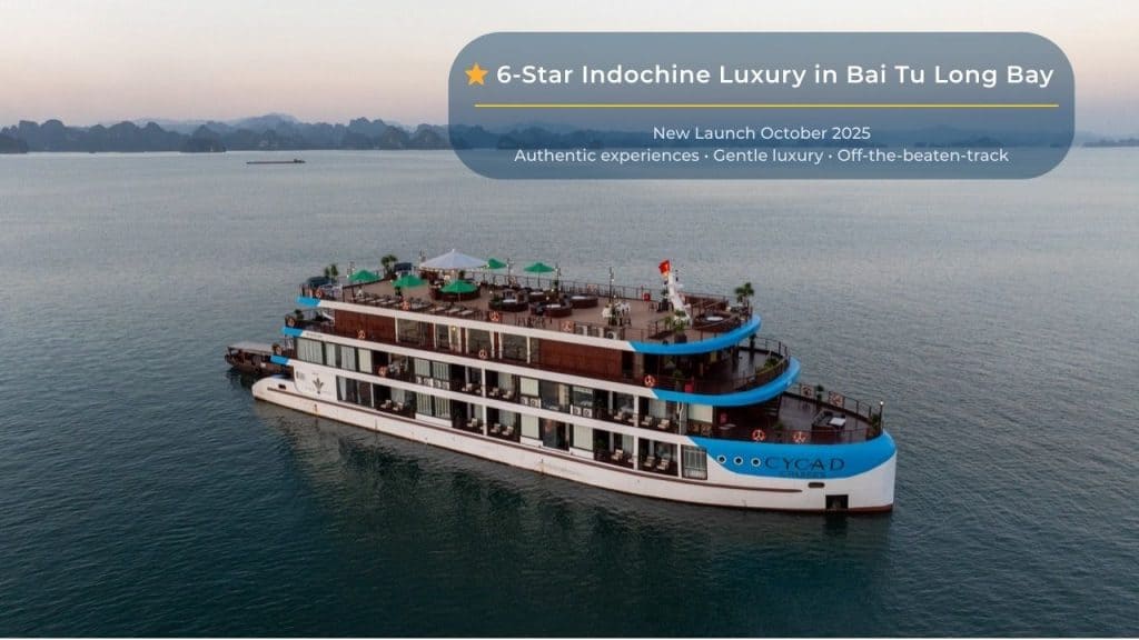 While many boats follow classic Halong Bay routes, Cycad Cruise focuses on a quiet Bai Tu Long Bay itinerary with longer cruising time, fewer boats, and more open horizons. The ship itself is 6โญ Indochine style with lobster fine dining and bathtubs in every cabin, making it a strong choice among best vietnam cruises for travelers wanting privacy and comfort.