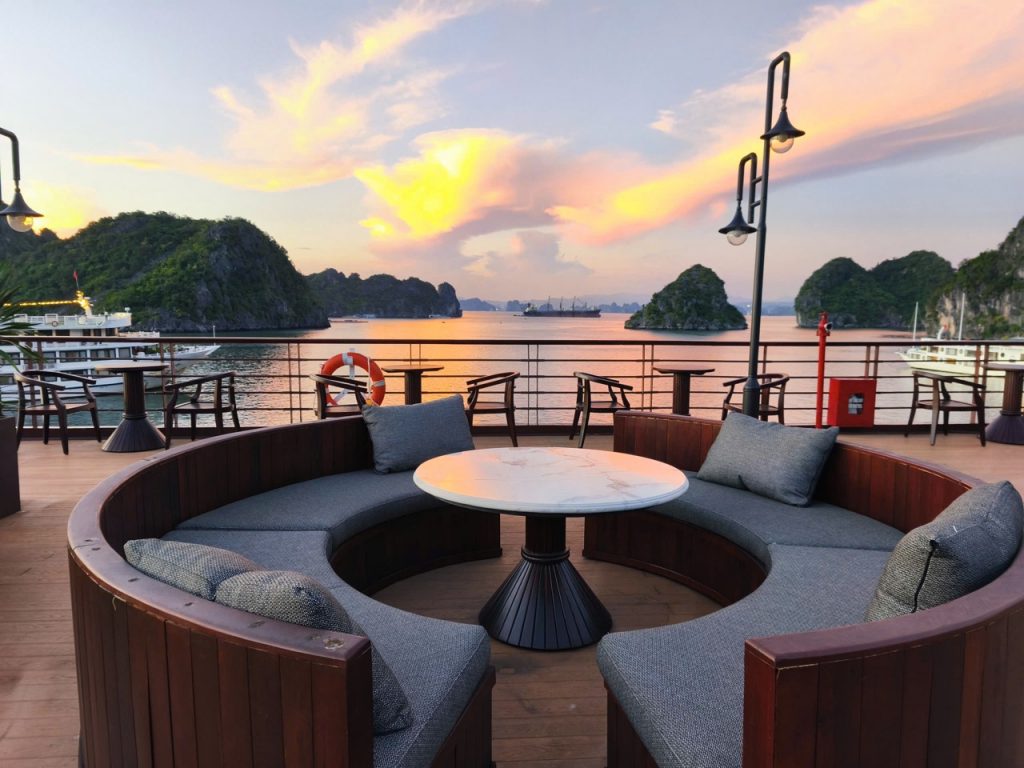 - ๐ 17:00 โ 19:00 โ Anchor again near Cong Do; enjoy another golden-hour Happy Hour on the sundeck or quiet time on your balcony as the sky turns pink and violet.