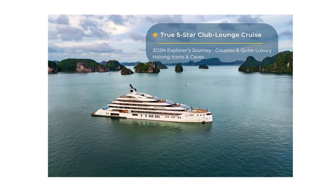 Across three unhurried days and two starlit nights, Grand Pioneers II Halong Bay Cruise 3D2N invites you to explore the legendary seascape of Halong Bay and the quieter curves of Lan Ha Bay in true resort-style comfort. This is an Explorer’s Journey designed for travelers who want more than a quick Halong Bay overnight cruise—it’s a slow, scenic escape where caves, hidden beaches and day-boat adventures unfold at a gentle, human pace. Onboard, the ship feels like a boutique resort at sea, with a four-season pool, cozy lounges and refined dining that blend seamlessly into any premium Vietnam tour package. Whether you’re a couple seeking romance, a family on a once-in-a-lifetime Vietnam trip, or friends building a custom vietnam trip package with ViettrendTour, this cruise becomes the glowing centerpiece of your itinerary of Vietnam.