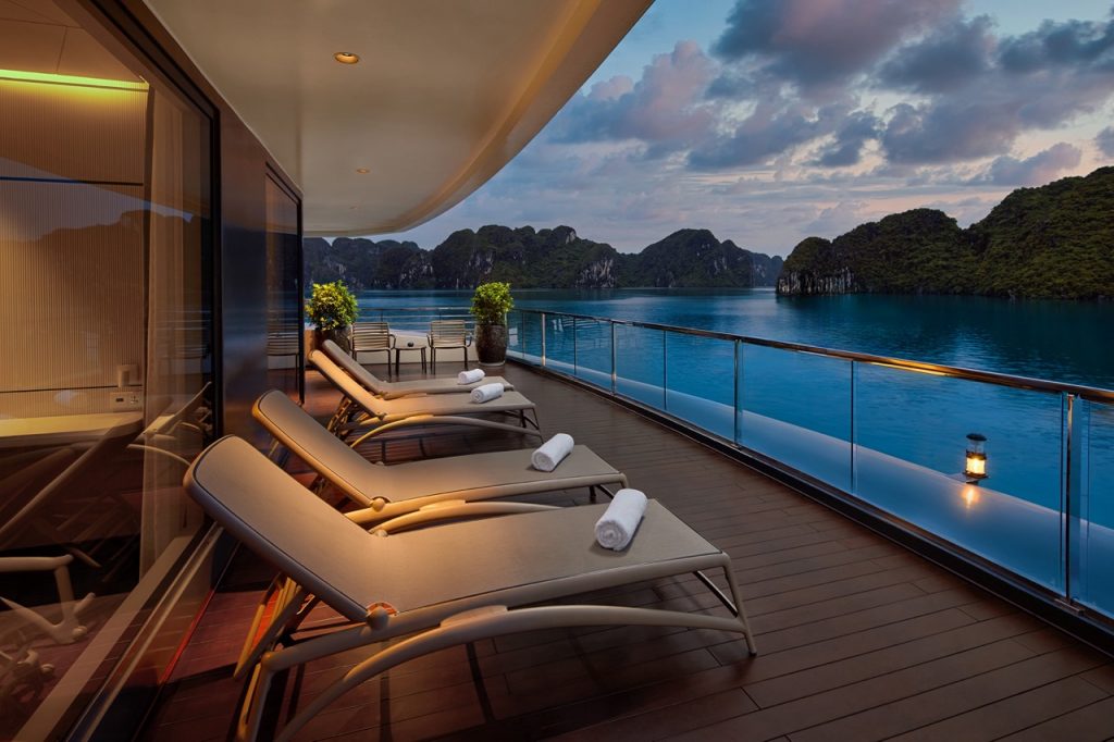 The day begins with pastel colors spilling softly across the sky. From the sundeck, Halongโs peaks appear as dark blue ink strokes against a slowly brightening horizon. A short, guided meditation or Taichi session invites your body to wake gently; the air is cool, the bay almost silent, and itโs easy to forget that bustling Hanoi is just a few hours away by road or by our luxury private transfer from Hanoi to Halong.