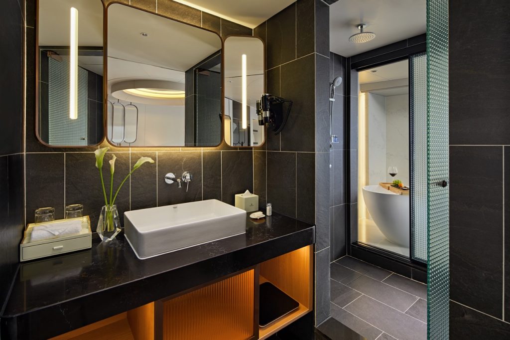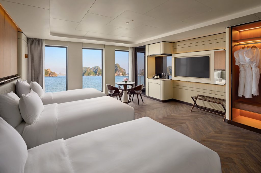 On Grand Pioneers II Cruise, cabins are designed as calm, light-filled retreats after each dayโs exploring. Entry-level rooms offer large windows over Halong Bay, while higher categories add private balconies for sunrise coffee and sunset toasts. Families can request connecting or side-by-side cabins; couples celebrating an anniversary or honeymoon can note this in advance so ViettrendTour helps secure more romantic setups, decorative touches, or special turndown moments where available. Whatever you choose, youโll always have en-suite marble bathrooms, climate control, and thoughtful amenities to make the bay feel like your front garden rather than just a passing view.