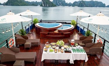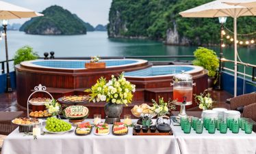- ๐ค Buffet Lunch on Board โ Halong seafood, hot stations, vegetarian options, served in a glass-lined restaurant.