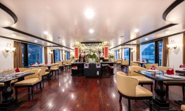 Majesty Prime Cruise is positioned as a floating resort blending Vietnamese royal aesthetics with French neoclassical design, prioritizing space, privacy, and full-suite comfort rather than mass-activity cruising.