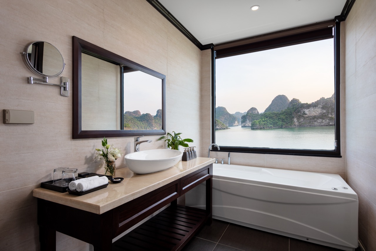 Morning roads unwind toward the sea. At Tuan Chau Marina, cool towels and a friendly crew welcome you aboard. Lunch is served as limestone silhouettes gather on the horizon and the water deepens to emerald. By mid-afternoon, kayaks slide into Trà Bầu’s sheltered lagoon; you paddle past mirrored cliffs and quiet coves, then float or swim before returning to the ship’s warm Jacuzzi. Sunset melts into Happy Hour, a hands-on cooking class, a candle-lit dinner—and a playful squid fishing session to close the night.