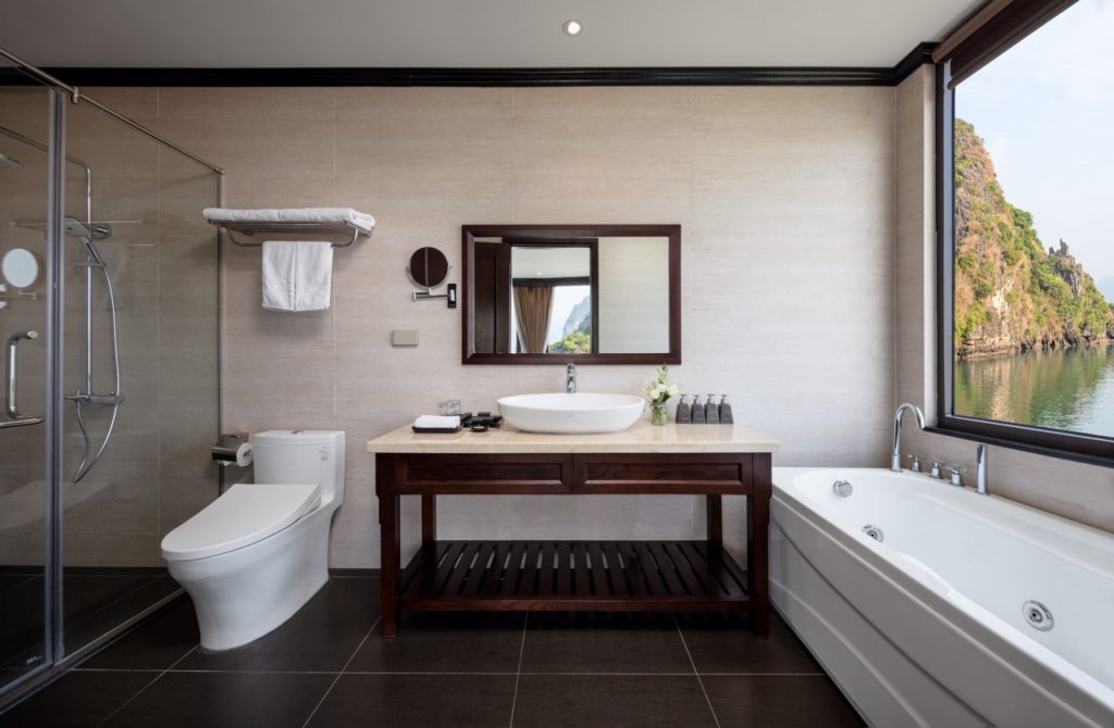 You’ll board at Tuan Chau, cruise through Ha Long–Lan Ha Bay, kayak/swim at Tra Bàu, join a Vietnamese spring-roll cooking class, enjoy Happy Hour at sunset, try seasonal squid fishing, sleep in an en-suite luxury cabin, greet the day with Tai Chi, then explore Trung Trang Cave on Cát Bà Island before brunch and disembarkation.