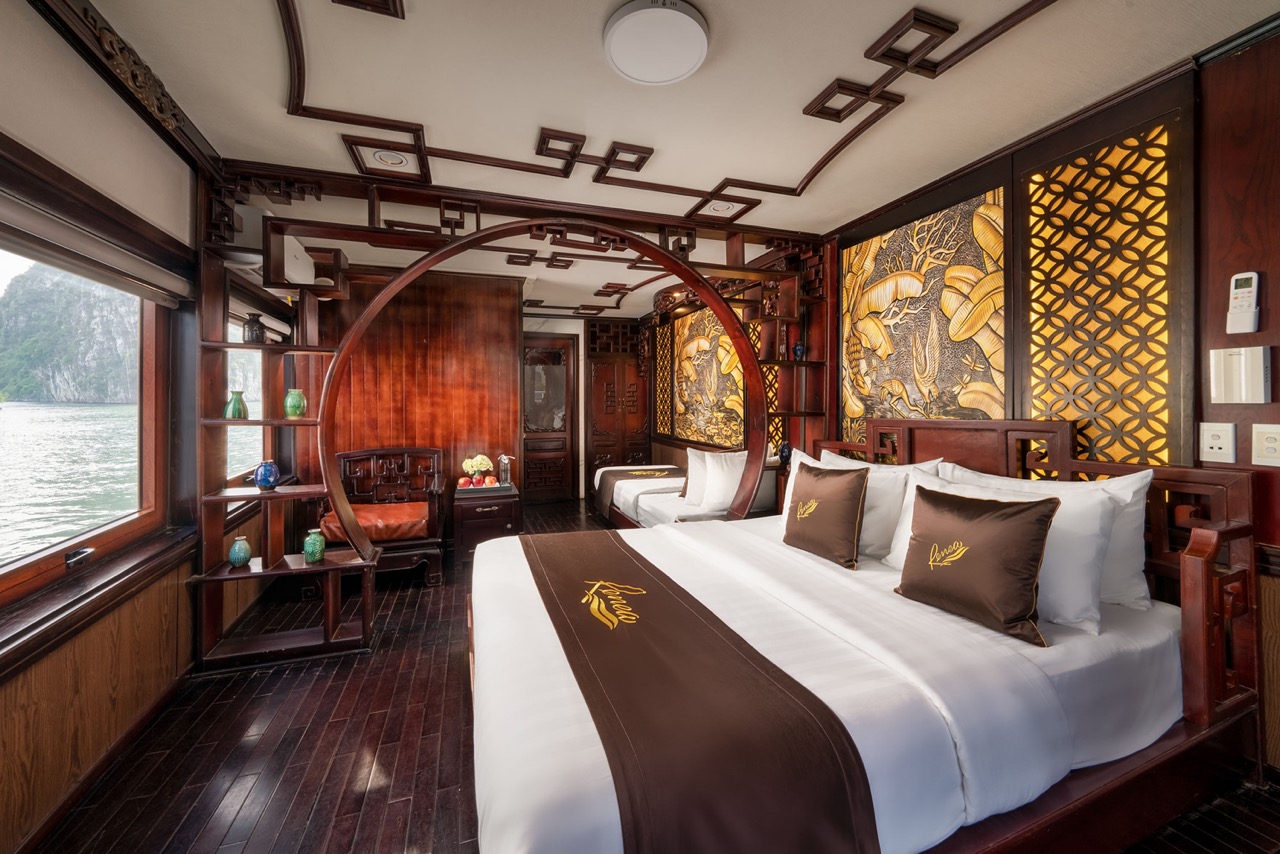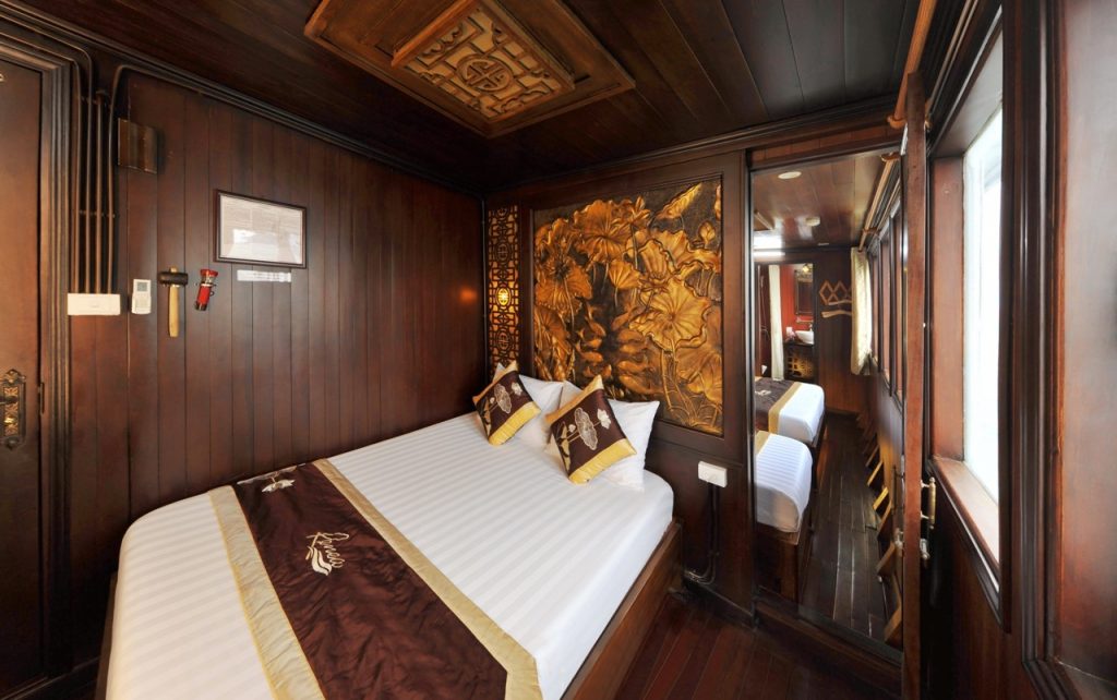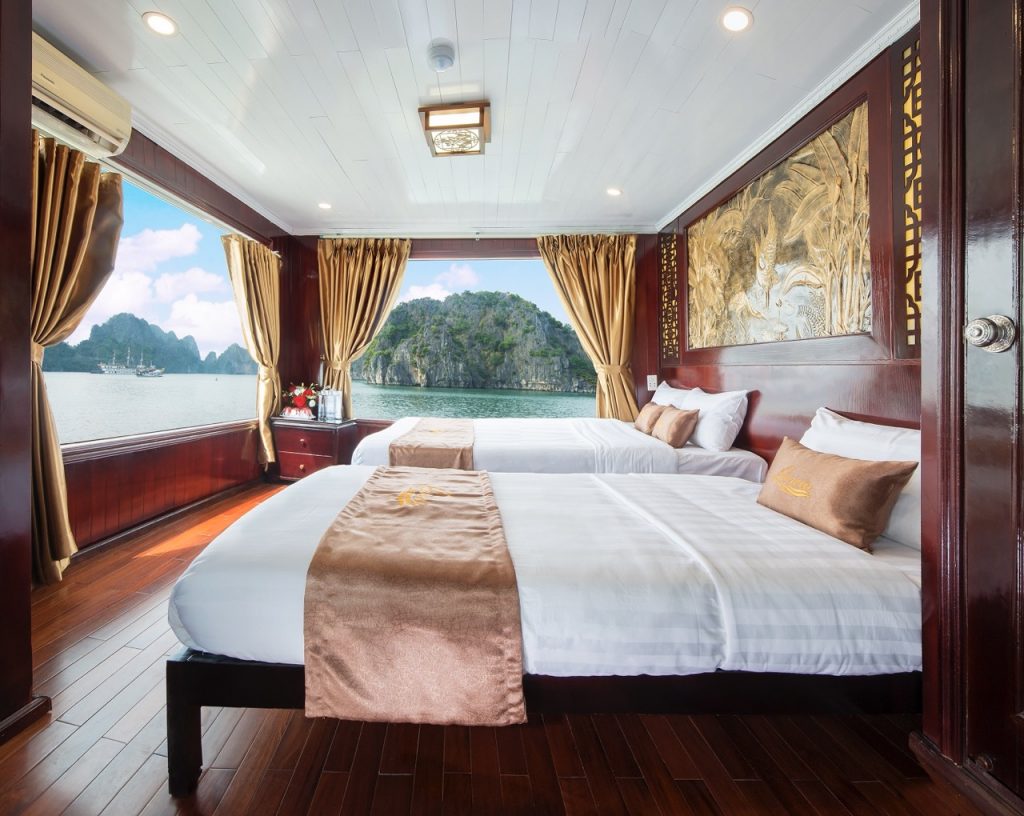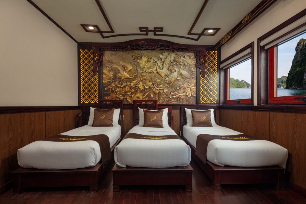 Renea Cruises operates traditional wooden junks with a mix of deluxe double, twin, triple and connecting cabins, plus a small number of simple suites, making it flexible for couples, groups of friends and families. All cabins feature private bathrooms, air-conditioning and windows looking out onto the bay, while triple and connecting options are especially convenient for families who want to keep everyone close in the same cosy wooden-junk atmosphere.