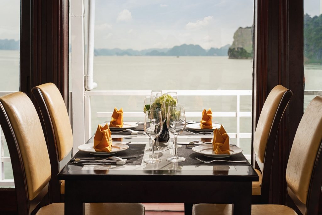 Renea Cruise serves a curated mix of Vietnamese and international dishes, with generous buffet lunches, elegant set dinners, and sunrise breakfasts. Vegetarian guests are looked after with clear, separate menus so everyone can relax and enjoy Bai Tu Long Bay.