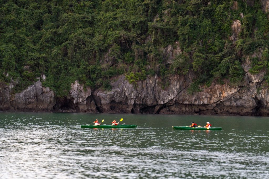 You do not need to be an athlete. Kayaking is optional and done in calm, sheltered sections of Bai Tu Long Bay, with life jackets provided and guides nearby. Guests who prefer a slower pace can stay on the boat, relax on the sundeck or choose the bamboo boat option instead. This makes the cruise suitable for a wide range of travellers, including those on a more relaxed vietnam tour package.