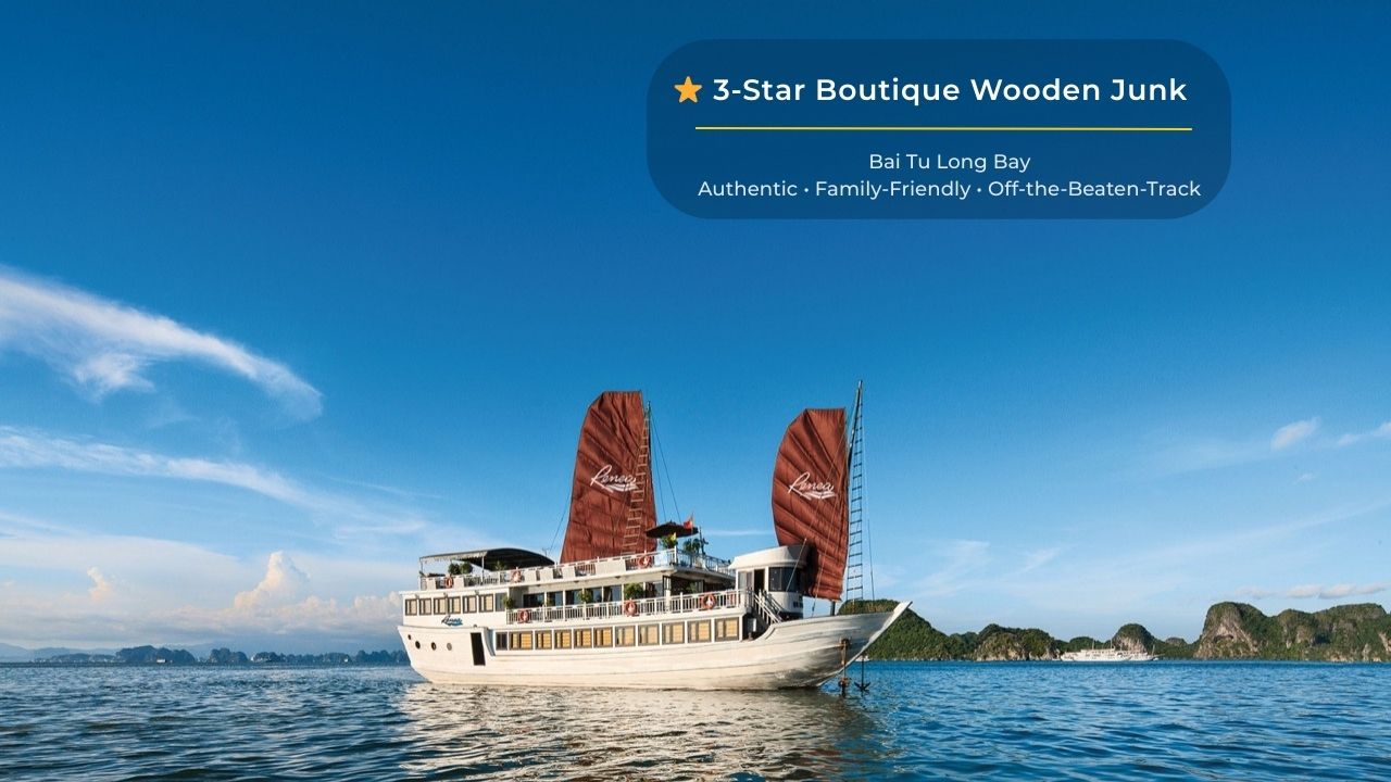 A 3D2N boutique wooden-junk cruise on Renea Cruise in Bai Tu Long Bay, starting and ending in Hanoi. Guests enjoy kayaking around Cap La, visiting Vung Vieng floating village, exploring Thien Canh Son Cave, Tai Chi, squid fishing and Vietnamese cooking demos. Ideal for families, couples and small groups seeking a quiet, mid-range bai tu long bay cruise with warm, authentic service and easy integration into broader vietnam travel packages.