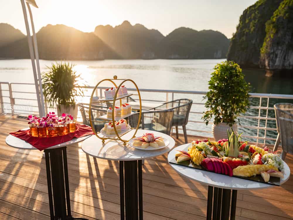 - 🍽 Gourmet Buffet Lunch – Savor fresh seafood, Vietnamese specialties, and international dishes while cruising.