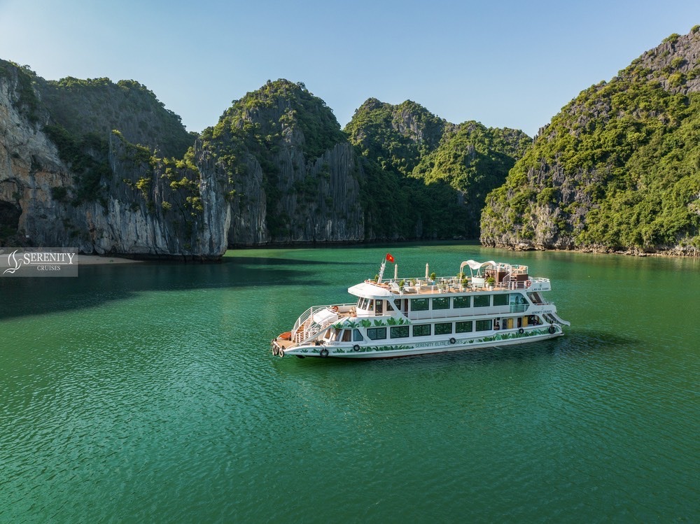 Morning unfurls softly over Cát Bà Island as you board Serenity Cruise and slide past the stilted houses of Cai Beo Floating Village into the jade hush of Lan Ha Bay. Karsts sharpen around East Gate, Tortoise Island nods from the waterline, and calm channels invite you to kayak and swim at a captain-chosen cove with a playful waterslide and giant floating pool. Back on deck, a light Royal Tea turns the return into a quiet celebration. It’s the perfect mini-cruise for families, couples, and soft-adventure travelers — and easy to pair with a longer Lan Ha Bay Cruise or a custom Vietnam trip package.