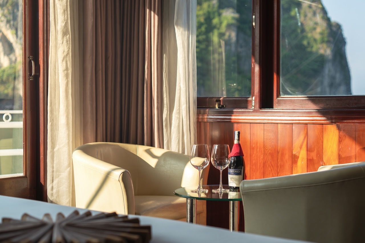Cabins on Swan Cruises are designed like a cozy floating boutique hotel: warm wood, soft bedding and big windows facing Bai Tu Long Bay. Couples can choose double or honeymoon-style cabins, friends and families can opt for twin, triple or connecting options, and select Suite Balcony cabins offer extra space and private outdoor corners perfect for sunset wine or early-morning coffee. Birthday and honeymoon setups can be arranged in advance, with simple decorations, a small cake or sparkling wine to mark your special moment at sea.