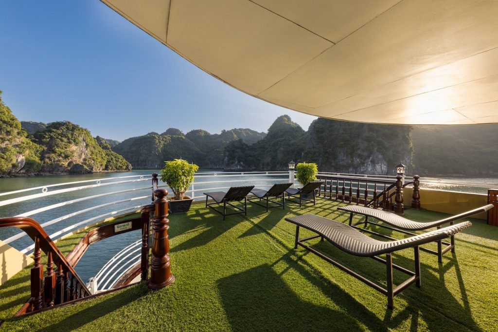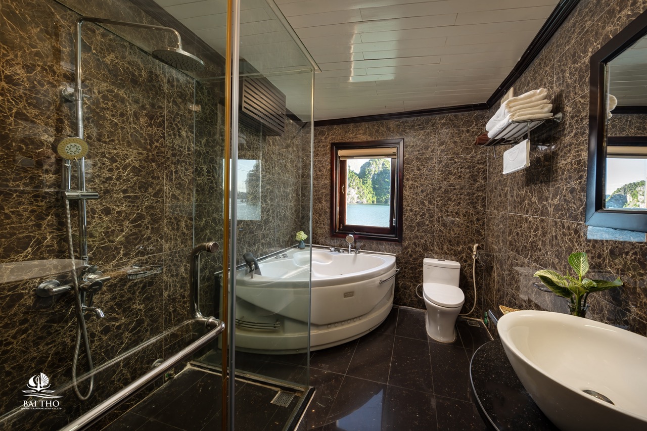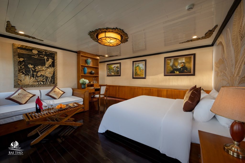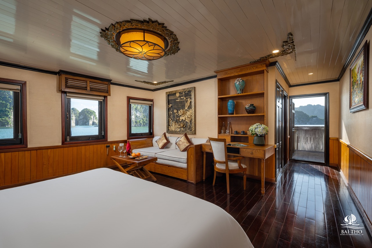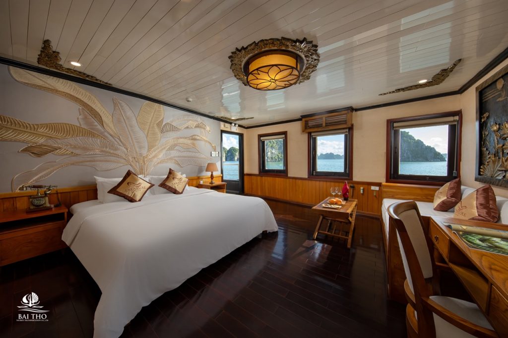 The most exclusive accommodation onboard — soak in your private jacuzzi as limestone karsts glow at golden hour. Perfect for anniversaries, honeymoons, and travelers who want space and serenity.
