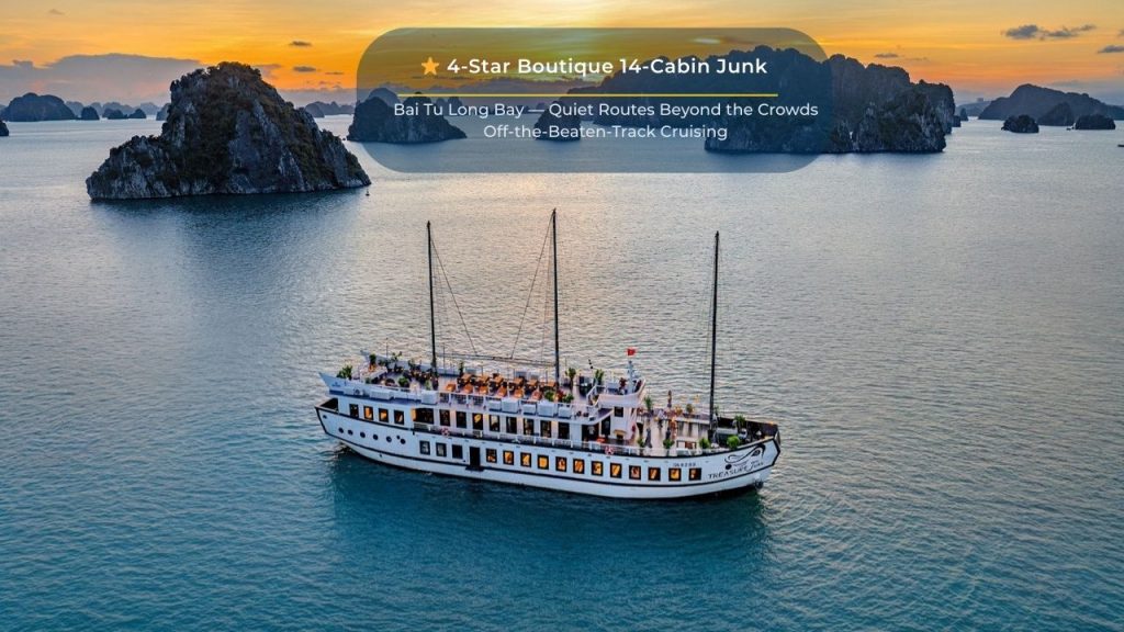 Yes — and this is exactly why travelers choose it. Bai Tu Long Bay sits northeast of Halong Bay and follows a more remote cruising route with far fewer boats, wider horizons, and longer moments of silence. On Treasure Junk, you experience the same limestone beauty but with more space, calmer waters, and a slower rhythm that many guests describe as “what Halong Bay used to feel like.”