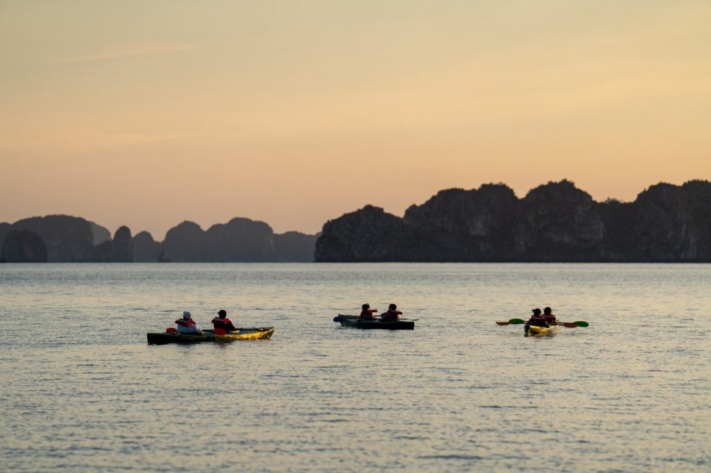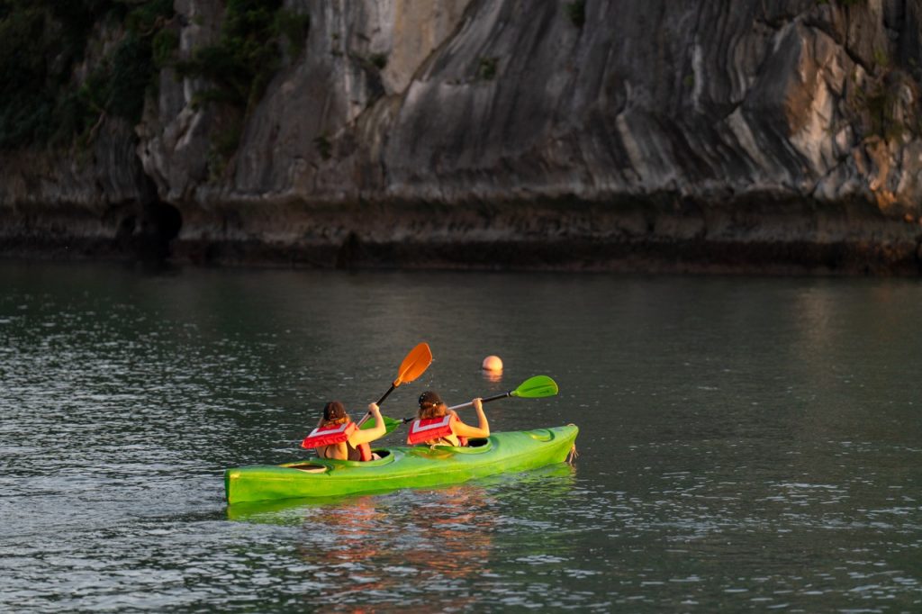 Kayaking is calm, guided, and suitable for beginners. The waters in Cong Do and Trinh Nu Cave are sheltered, and all safety equipment is provided. Your guide is always nearby, and participation is optional — you are welcome to relax onboard instead if you prefer a slower pace.