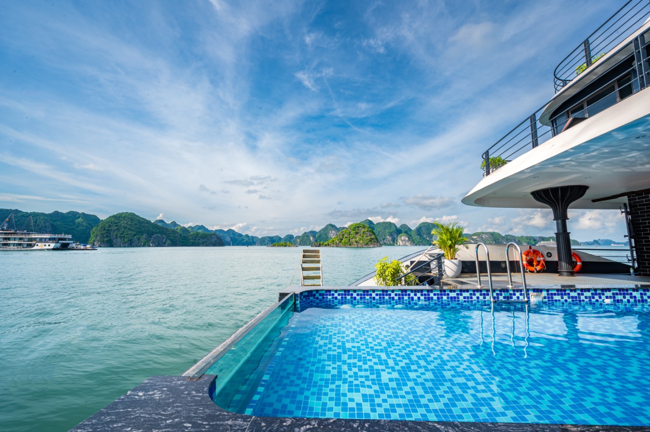 - ๐ซง 16:45โ17:30 โ Swim in the calm waters of Trร Bรกu or relax beside the onboard pool.